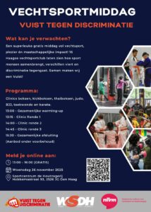 In samenwerking met WSDH en het NIVM (Nederlands Instituut voor Vechtsport & Maatschappij) organiseren wij een sportieve (vecht)sportmiddag voor iedereen en Haagse basisscholen in het bijzonder.